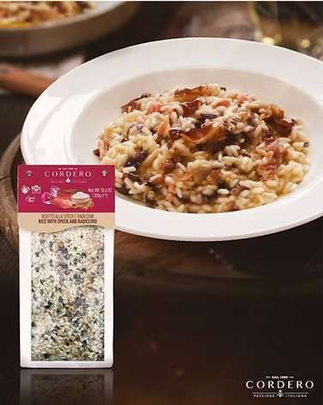 Zutaten: Carnaroli-Reis, Speck, Radicchio, Zwiebel, Petersilie, Lauch. Allergene: Kann Spuren von GLUTEN, NÜSSEN, SOJA, SELLERIE und SULFITEN enthalten. Nährwerte pro 100 g: Energie 1507 kJ/355 kcal; Fette 4,8g davon gesättigte Fettsäuren 0,8g; Kohlenhydrate 70g davon Zucker 0,8g; Ballaststoffe 1,0g; Eiweiss 7,4g; Salz 0,0g. Aufbewahrung: Kühl, trocken und lichtgeschützt lagern.